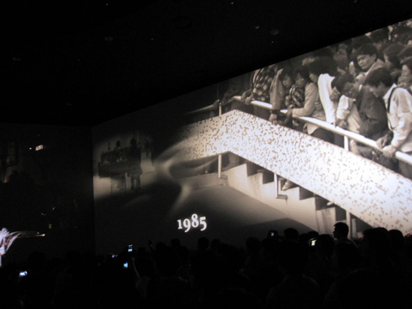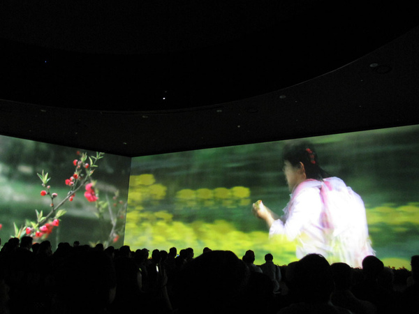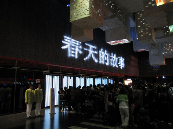 來到了第12樓「東方足跡」, 第一個子區域是一個很大的電影院, 主題叫”春天的故事”, 雖然說照片裡面很多人在排隊, 但其實可以不用那麼辛苦, 在這邊你可以坐下來休息一下, 旁邊還有廁所. 它電影一場大約是15分鐘, 裡面有700座位, 你不用排隊也一定進的去.