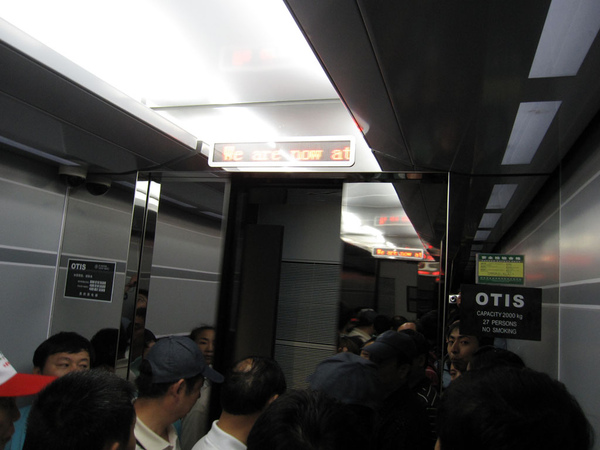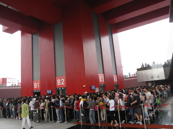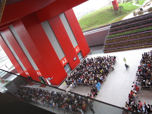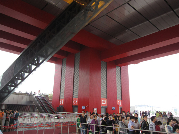 因為能夠走進來的民眾都是有拿到預約卷的, 而且前面已經控管過一次, 這邊排隊時間很固定. 原來中國館那四根大柱子就是通往上層電梯, 一根大柱子裡面有四支電梯.