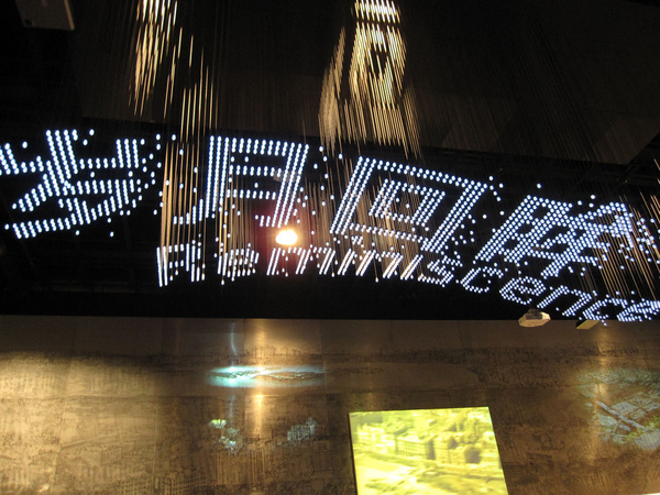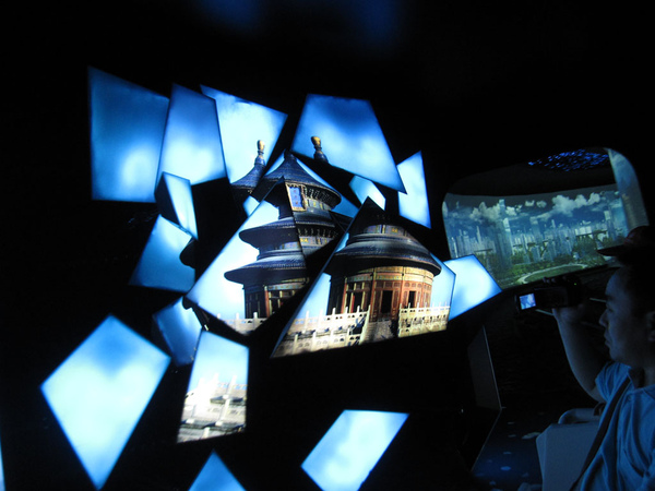 每到一個地方列車會停留個幾十秒鐘, 背景會有音樂及講解旁邊展出的東西代表著什麼意義, 比方說最後一個單元以北京天壇和世界金融中心來對比.