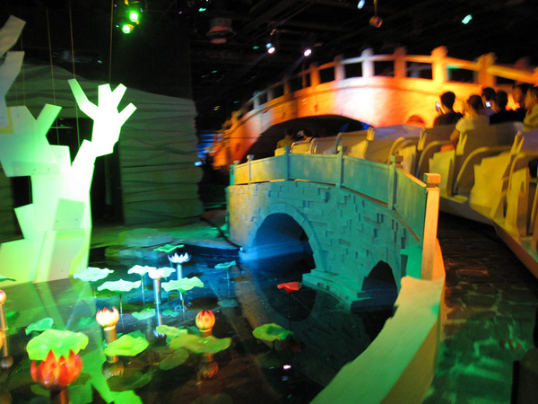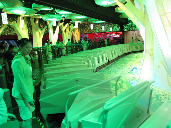 它是採用小型軌道車載人進入一間一間的小展區的方式來呈現.