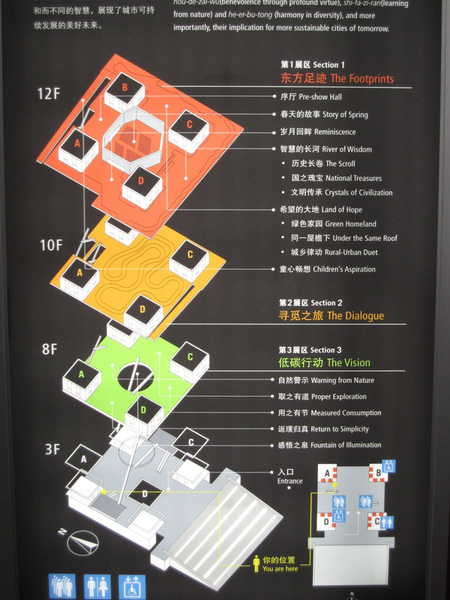 中國館的設計是讓遊客先坐電梯至最高樓層再一路往下逛的方式參觀, 展區分為三個主要主題「東方足跡」(12樓)、「尋覓之旅」(10樓)、「低碳行動」(8樓),