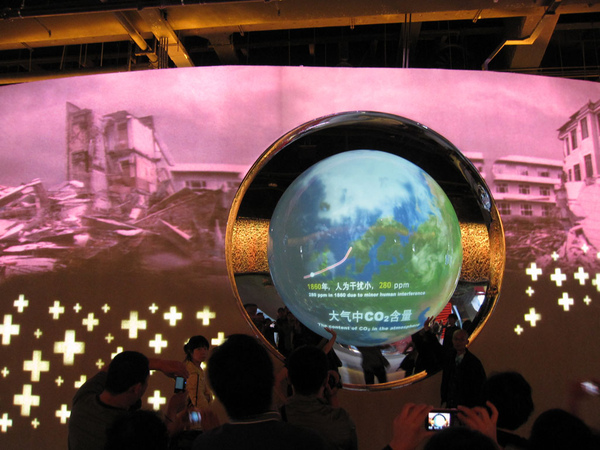 軌道車坐完之後繼續往下走來到下一個展區, 8樓的「低碳行動」, 中國是目前世界上碳排放量最高的國家, 這當然跟目前中國的產業型態是世界的工廠以及人口眾多有很多因果關係,